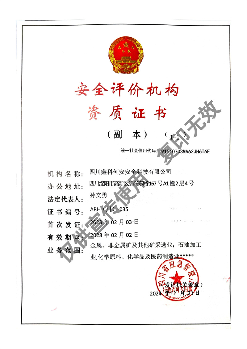 四川鑫科創(chuàng)安安全科技有限公司成立于2020年,是川北地區(qū)取得資質(zhì)的民營安全評價機構(gòu)(資質(zhì)證書編號:APJ-(川)-035)。并于2022年牽頭成立綜合應(yīng)急救援隊伍 - 綿陽曙光應(yīng)急救援中心。